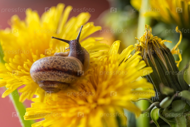 Маленькая улитка ползает по желтому цветку одуванчика