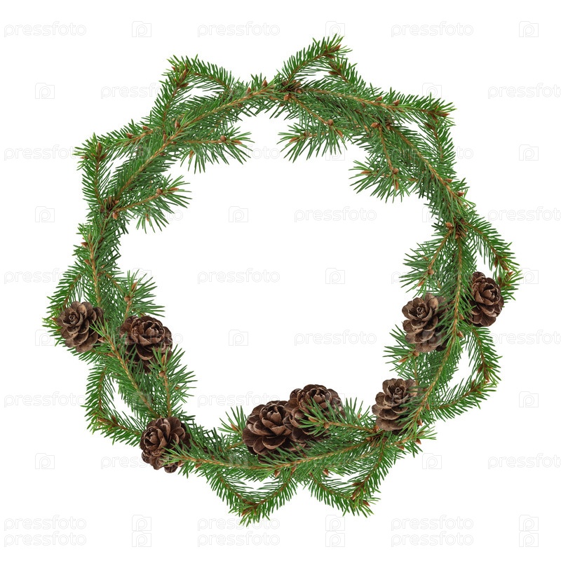 Рождественский еловый венок украшен сосновыми шишками на белом фоне