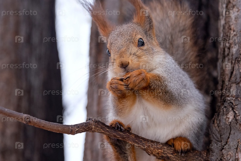 Милая белка ест орехи в зимнем парке, сидя на ветке дерева
