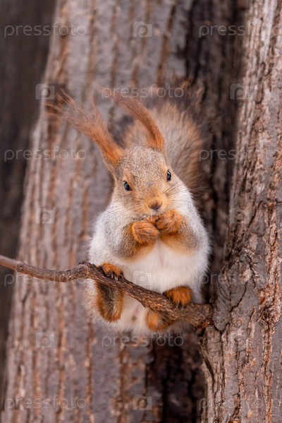 Милая белка ест орех в зимнем парке