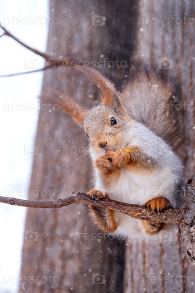 Милая белка ест орехи в зимнем парке, сидя на ветке дерева