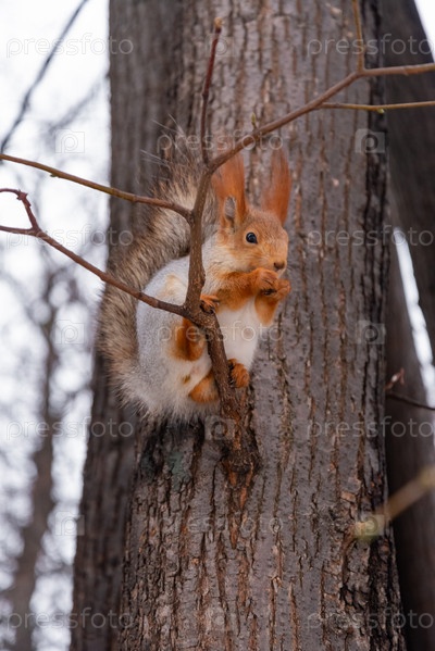 Милая белка ест орехи в зимнем парке, сидя на ветке дерева
