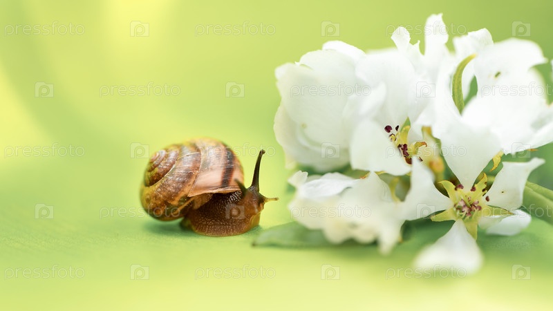 Маленькие цветы улитки и белые яблоки на ярко-зеленом фоне. Концепция весеннего времени и периода цветения