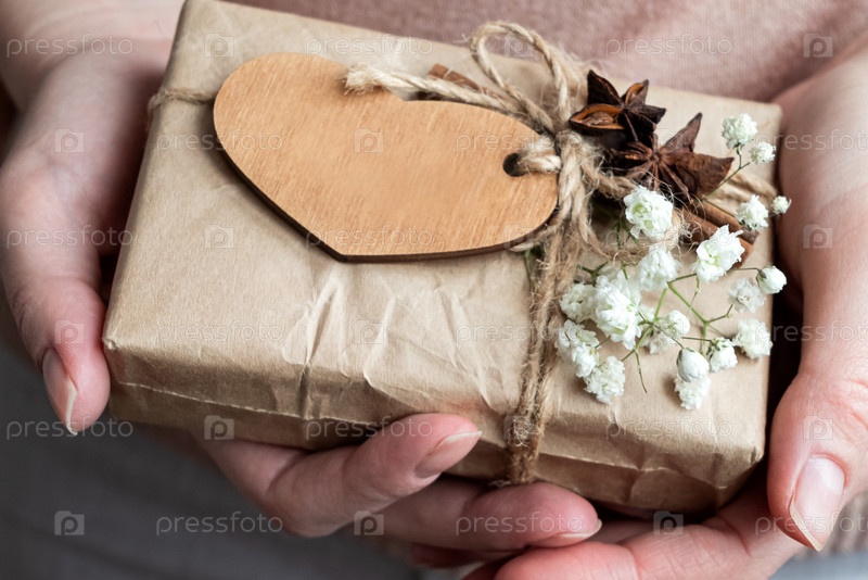 Подарочная коробка, завернутая в крафт-бумагу, украшенная деревянным сердцем и белыми цветами в руках человека. Празднование дня святого Валентина