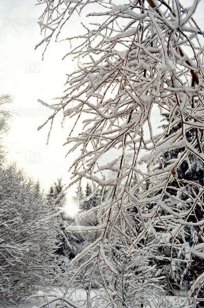 Зимний лесной пейзаж с видом на ледяные ветки деревьев в солнечном свете