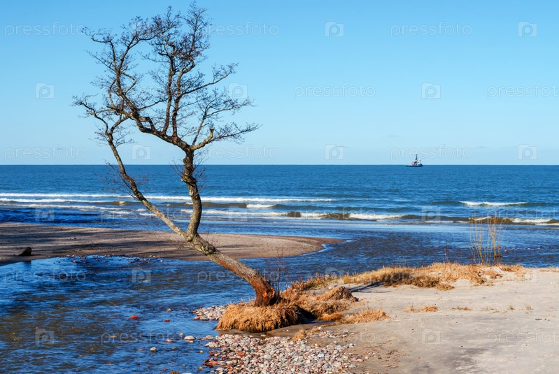 Одинокое дерево на берегу моря. Живописный морской пляж