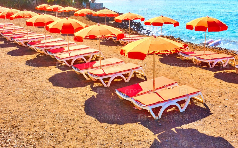 Зонтики и шезлонги на морском пляже