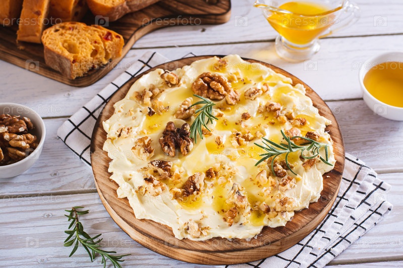 Модная масляная доска с медом и грецкими орехами на завтрак на столе