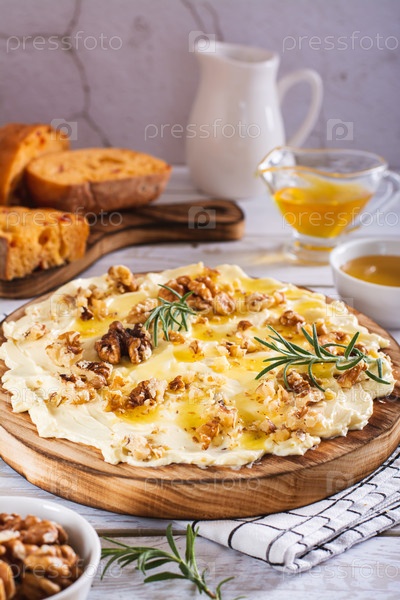Масляная доска с медом и орехами сладкий десерт на столе вертикальный вид
