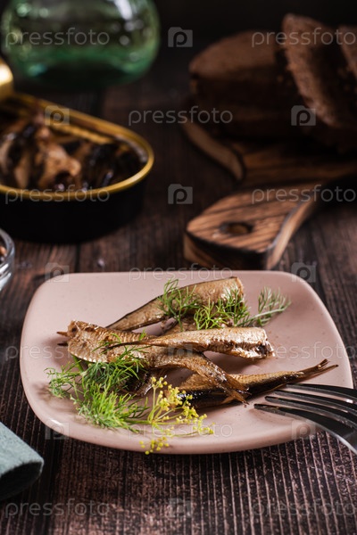 Консервы шпроты в масле и укроп на тарелке на столе вертикальный вид