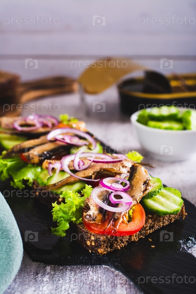 Бутерброды на ржаном хлебе с помидорами, огурцами, шпротами и луком на шифере по вертикали