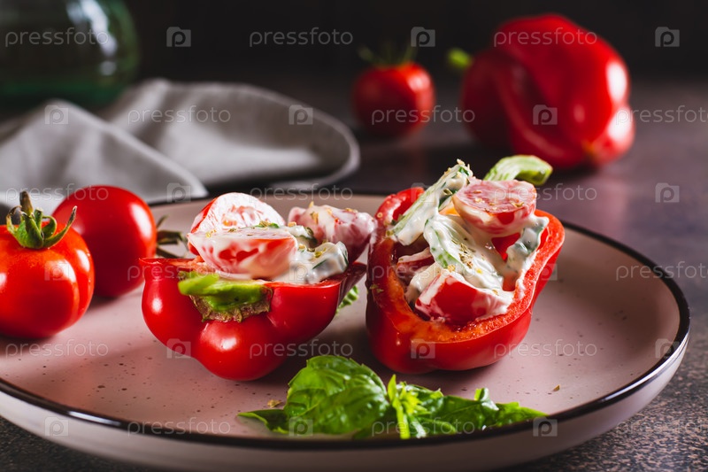 Свежий болгарский перец, фаршированный огурцами, помидорами и греческим йогуртом на тарелке