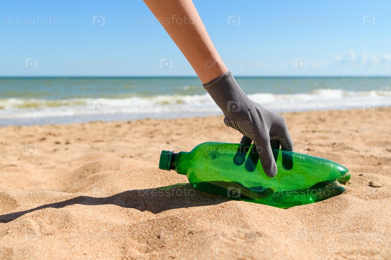 Сбор мусора на пляже. Пластиковая бутылка и рука волонтера на фоне моря