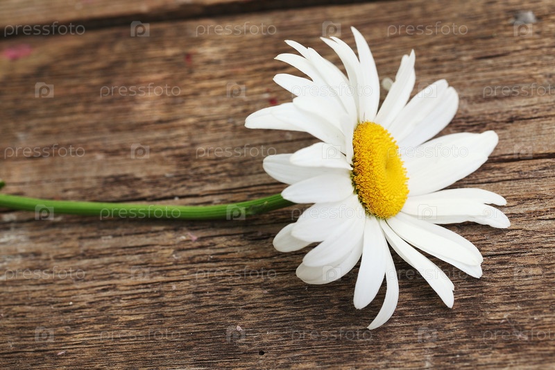 Ромашка в каплях воды, на деревянном фоне, макросъемка