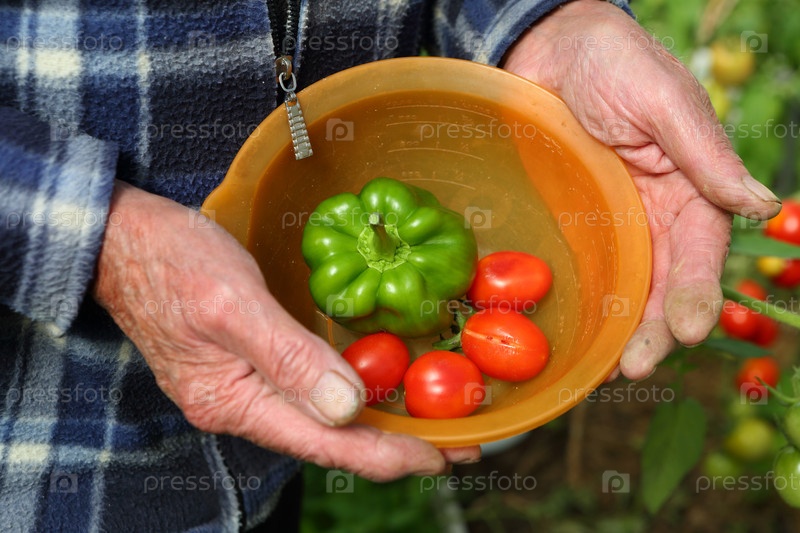 Дачник держит в руках тарелку с помидорами и болгарским перцем