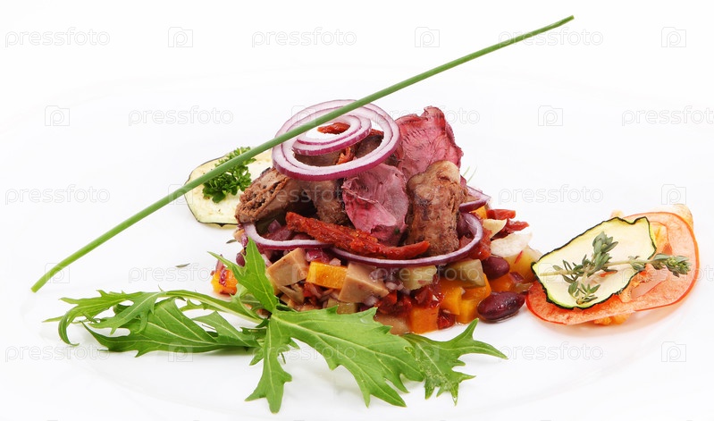 Печень с тушеными овощами, фасоль руккола