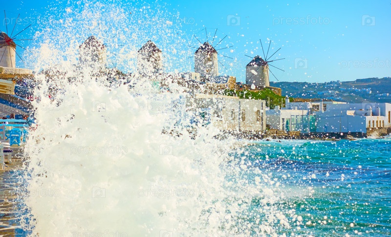 Морской прибой и ветряные мельницы на Миконосе