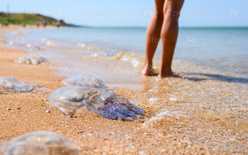 Большие медузы на берегу моря на фоне отдыхающих туристов. Селективный фокус на больших медузах