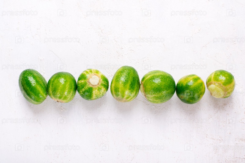 Маленькие круглые огурцы с полосками, напоминающими арбуз, выстроились в линию на белом столе. Скопируйте пространство. Вид сверху