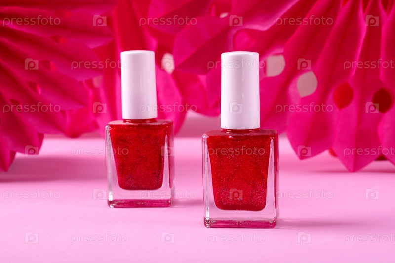 Лак для ногтей с красным блеском в немаркированных флаконах на фоне розовых бумажных вееров. Макет косметического продукта