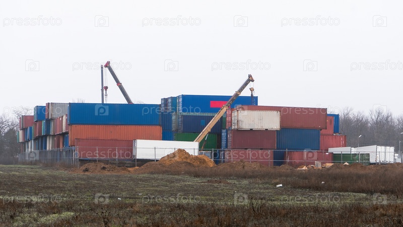 Хранение старых контейнеров. Старый контейнерный двор в доке порта отгрузки в ожидании транспортировки