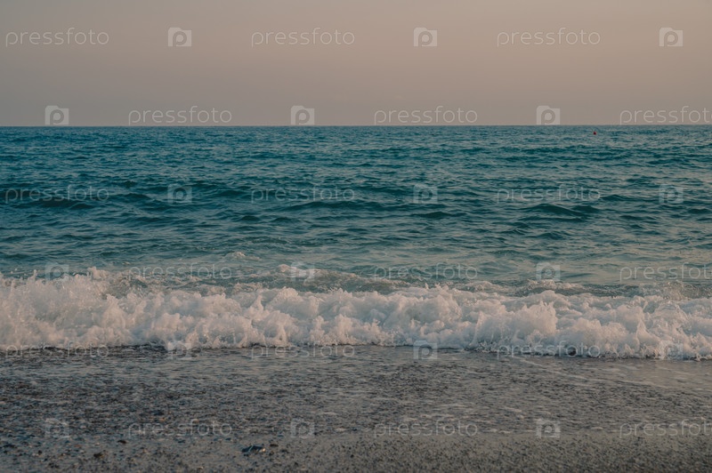 Волны Средиземного моря накатывают на песчаный турецкий пляж. Прекрасный турецкий вечер
