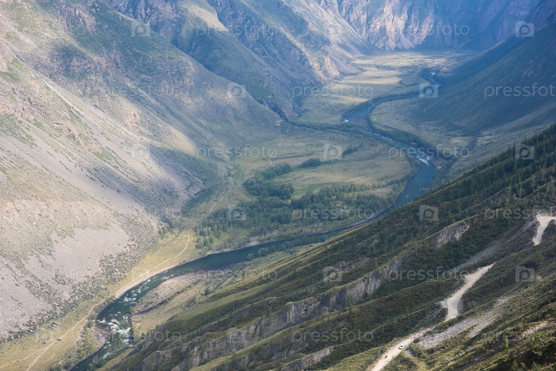 Панорама перевала Кату Ярык и долины реки Чулышман. Республика Алтай, Россия, прекрасный летний день