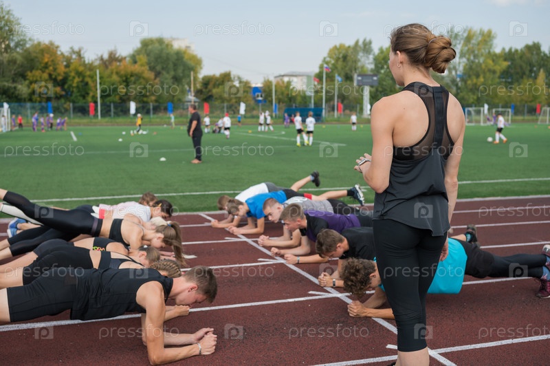 Женский тренер и группа детей проводят тренировку на стадионе. Тренировки в школьном спортзале или легкая атлетика