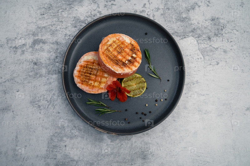 Ролл из лосося на гриле с моцареллой. Украшен зеленью лайма и съедобным цветком
