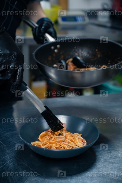 Паста с морепродуктами от шеф-повара с мидиями, базиликом и помидорами
