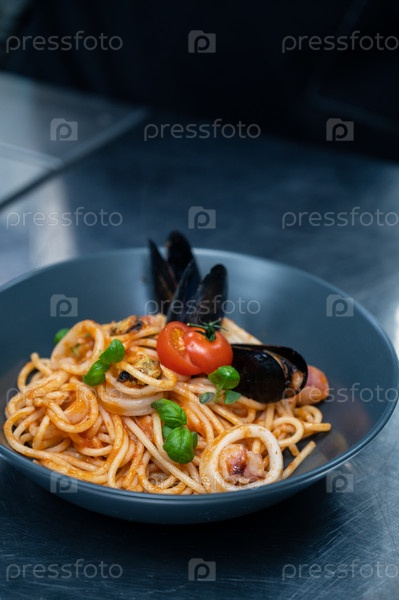 Паста из морепродуктов с мидиями с базиликом и помидорами в черной тарелке