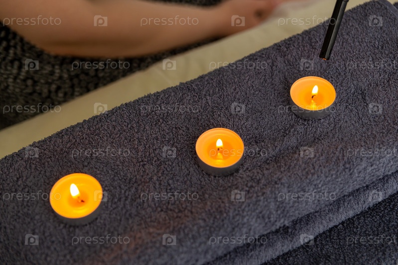 Горящие свечи и полотенца на столе в спа-салоне, место для текста
