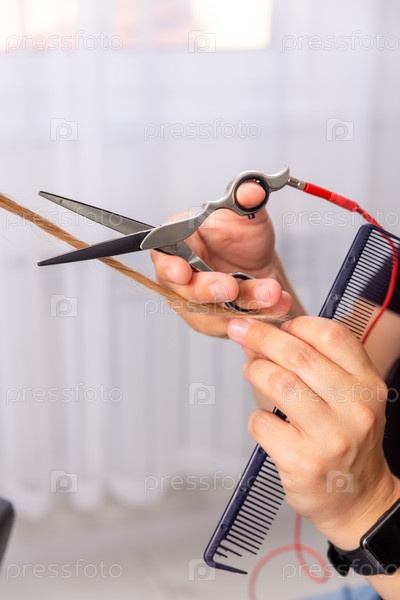 Профессиональный парикмахер держит расческу и горячие термоножницы, срезающие кончики длинных прямых волос крупным планом