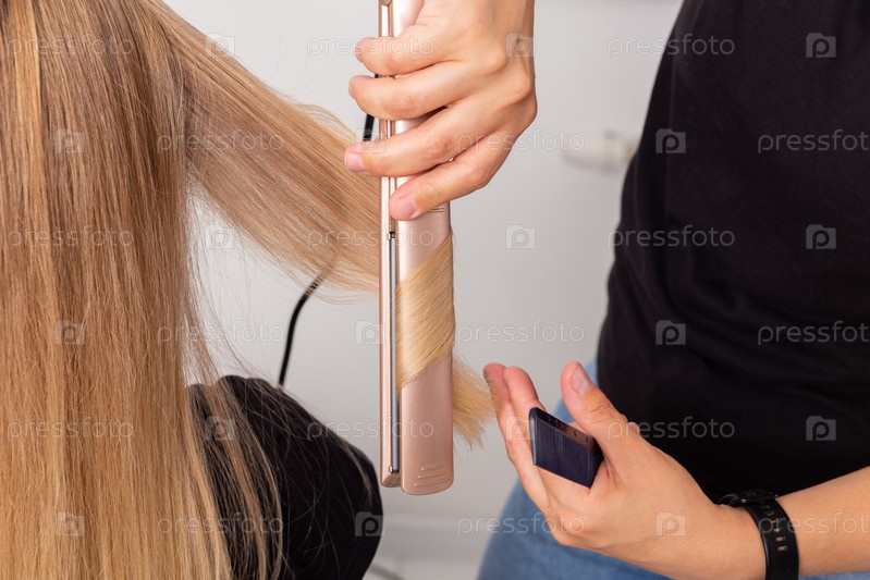 Парикмахер готовит женщину, которая делает прическу с кудрями с помощью щипцов для завивки