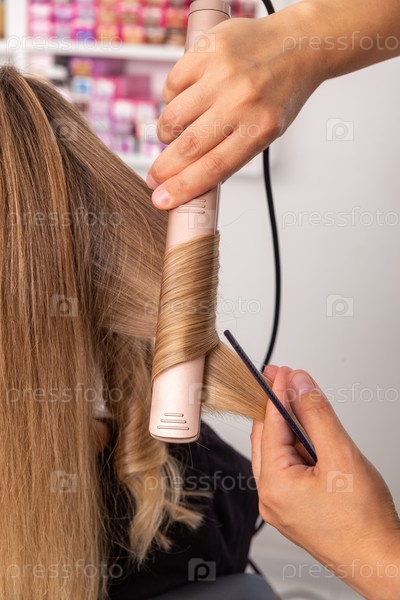 Парикмахер готовит женщину, которая делает прическу с кудрями с помощью щипцов для завивки