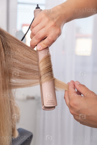 Парикмахер готовит женщину, которая делает прическу с кудрями с помощью щипцов для завивки