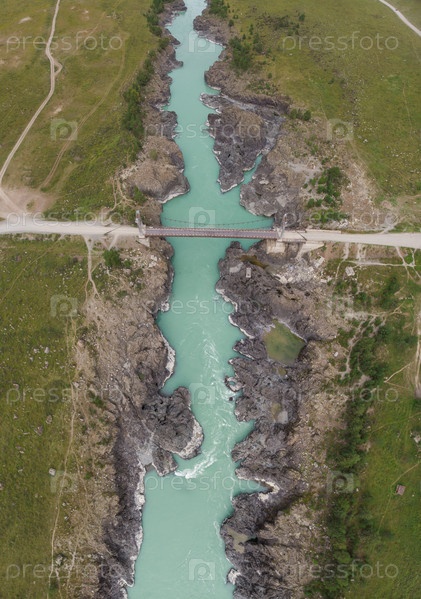Пороги реки Катунь в летний день у моста Ороктой в Республике Алтай, Россия, Алтайские горы, вид с воздуха с дрона