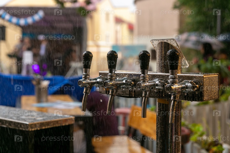 Хромированные краны для разливного пива в уличном кафе под дождем. Деталь пивной машины, диспенсер для пива, крупный план, выборочный фокус, ретро-стиль