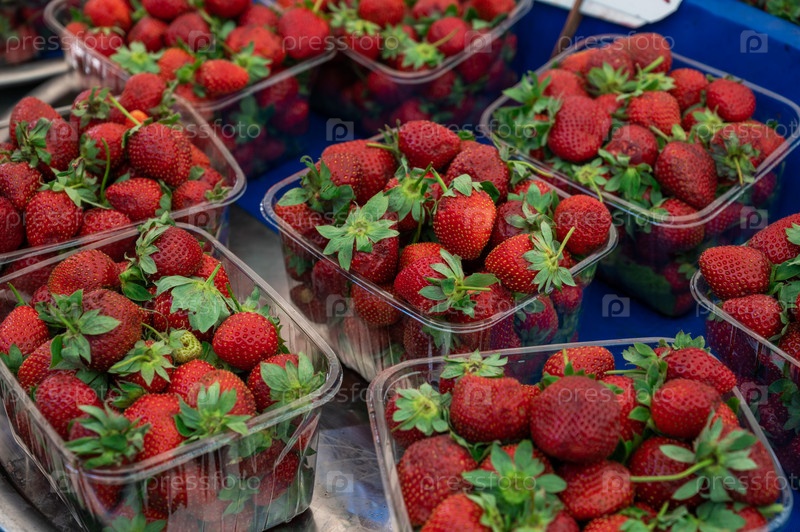 Продажа клубники на традиционном фермерском турецком рынке, прилавок со свежими фруктами