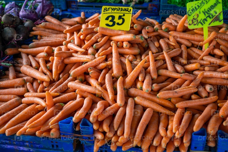 Продажа моркови на традиционном фермерском турецком рынке, прилавок со свежими фруктами