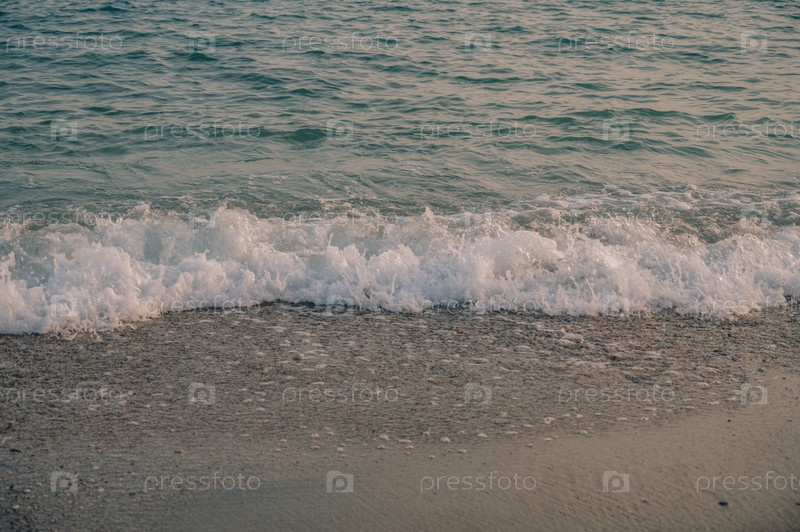 Волны Средиземного моря накатывают на песчаный турецкий пляж. Прекрасный турецкий вечер