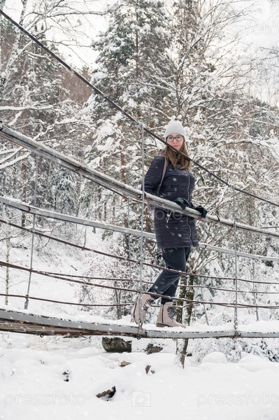Женщина гуляет по заснеженному зимнему лесу