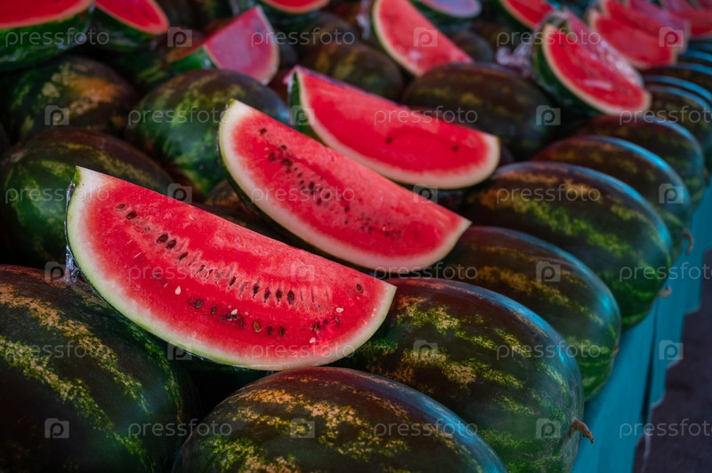 Продажа свежих арбузов на традиционном фермерском турецком рынке, прилавок со свежими фруктами