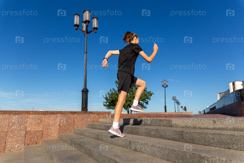 Молодая женщина в черной одежде бежит по лестнице