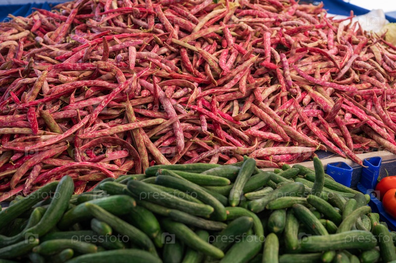 Продажа красной фасоли на традиционном фермерском турецком рынке, прилавок со свежими фруктами