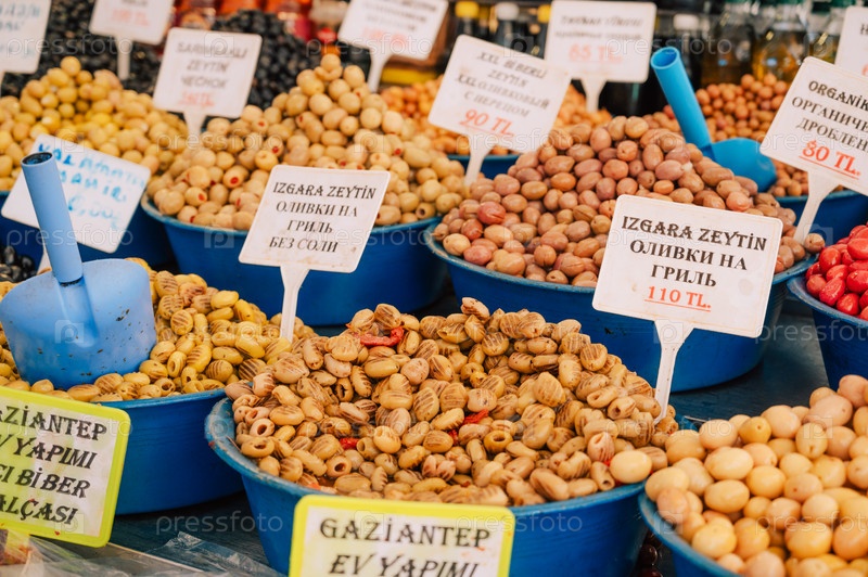 Торговля различными оливками на турецком рынке