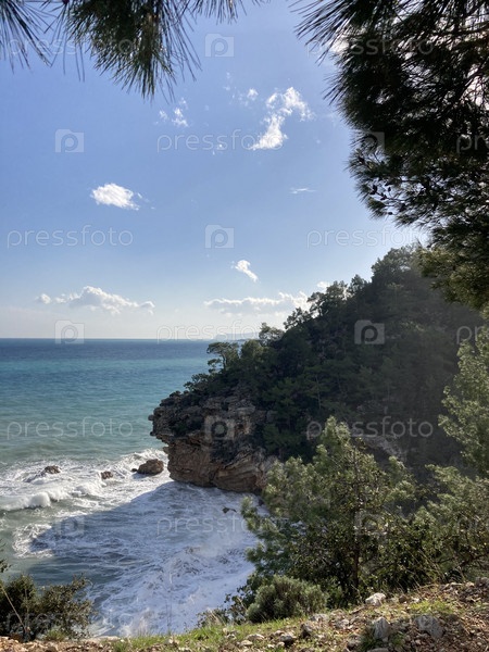 Небольшая уединенная лагуна среди скал и бурное бурное море Турция Анталия