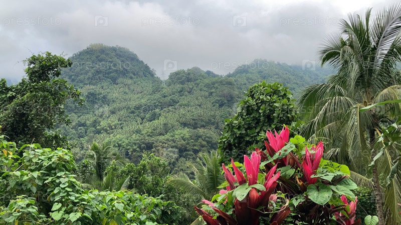 Тропические горы, покрытые джунглями с низкими облаками пальм и тропических растений
