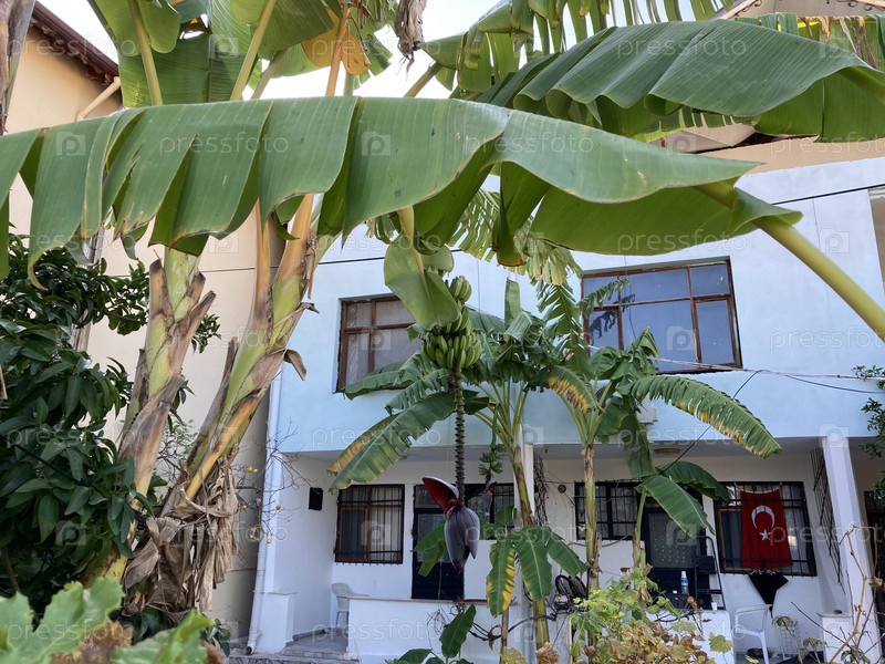 Банановая пальма, на которой растут маленькие бананы возле дома в Турции