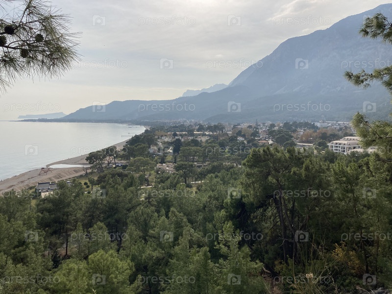 Вид на деревню у моря с горы Турция, провинция Анталья